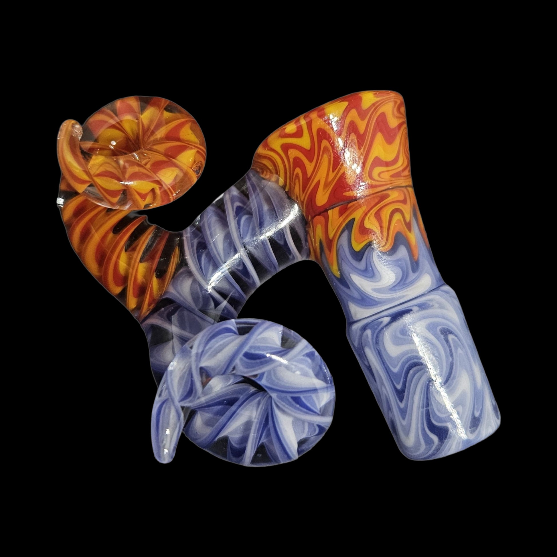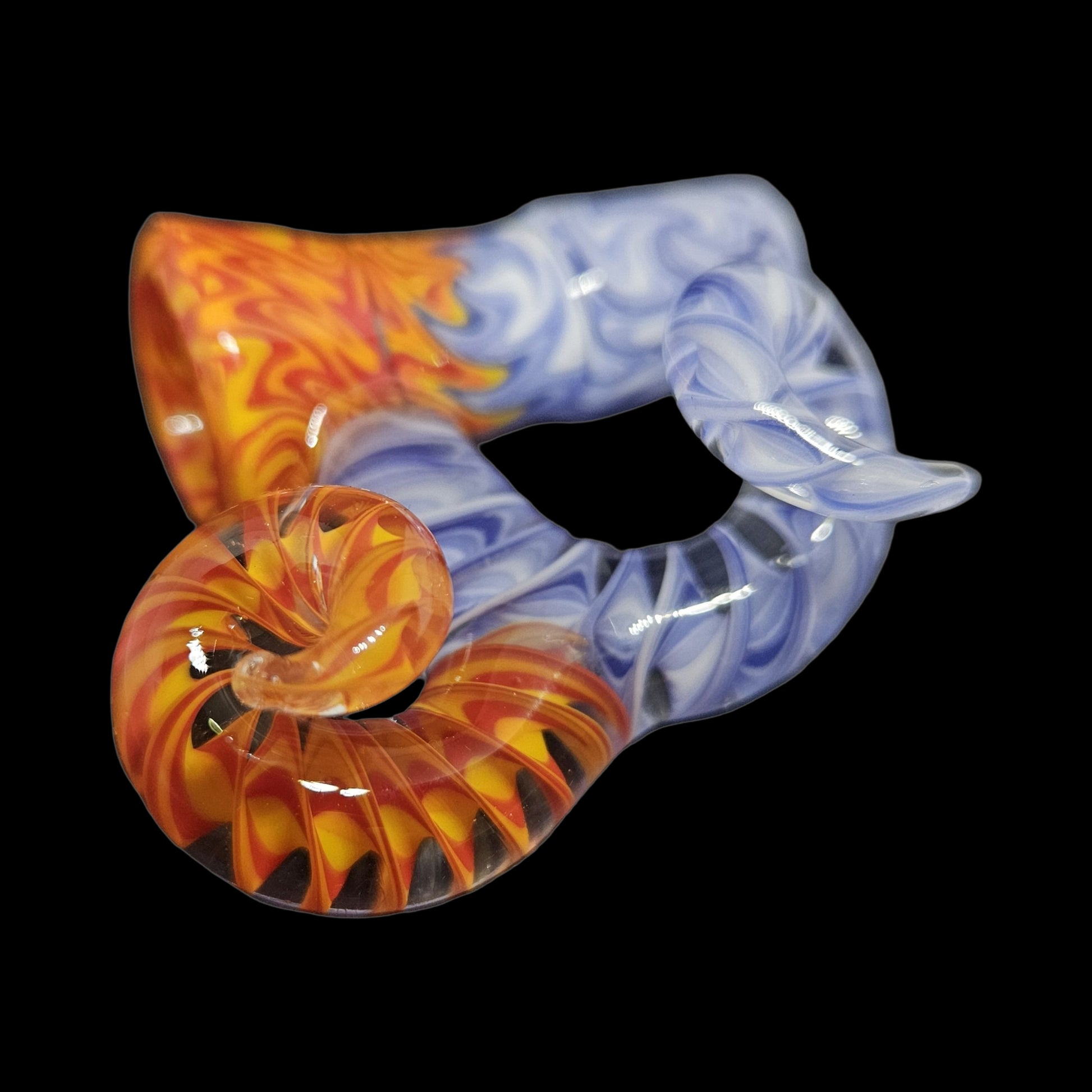 This fully worked bowl is made with 3 transitioning differentpatternsto make up this fire and ice bowl. The horns are composed of flattened sections that have been encased and spun into ribbon cane to match the piece perfectly