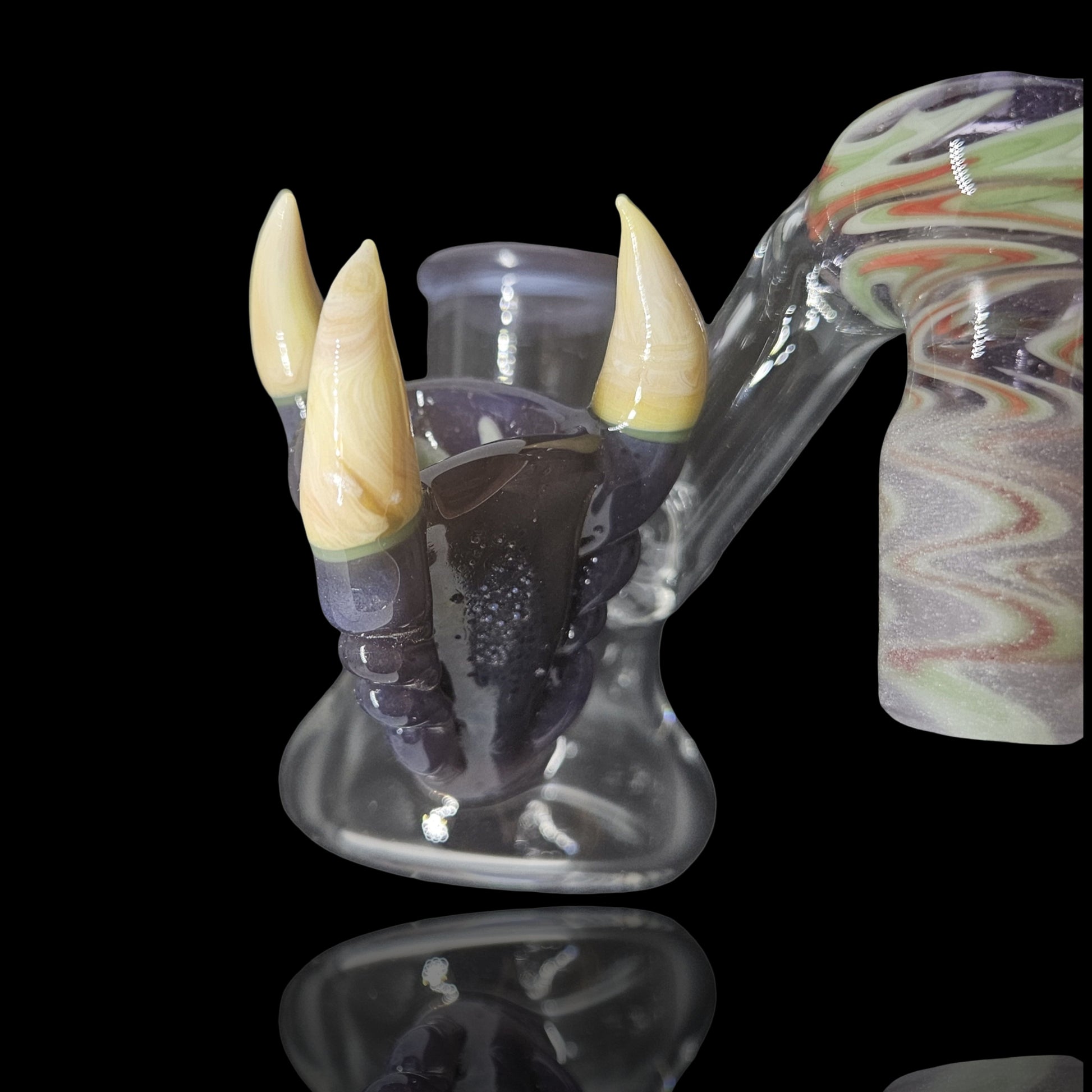 This fully worked ashcatcher is made with a clear joint with lip wrap so you can see your fully worked bowls through the window. The male joint features a rewig to a wig wag that matches the hidden wig wag in the claw. The claw is made of a custom hand mixed color. This drop down is sure to keep your tubes water clean for days.