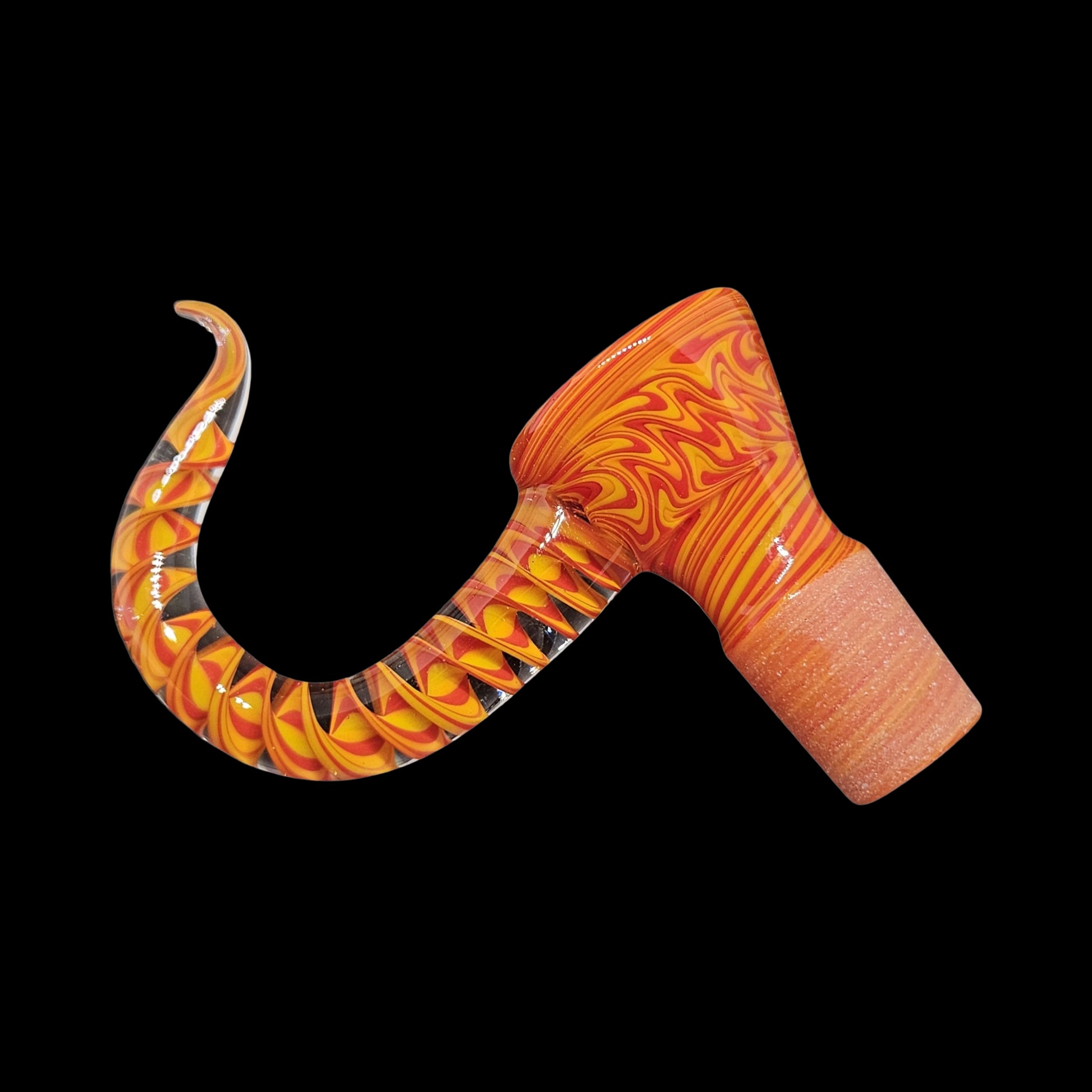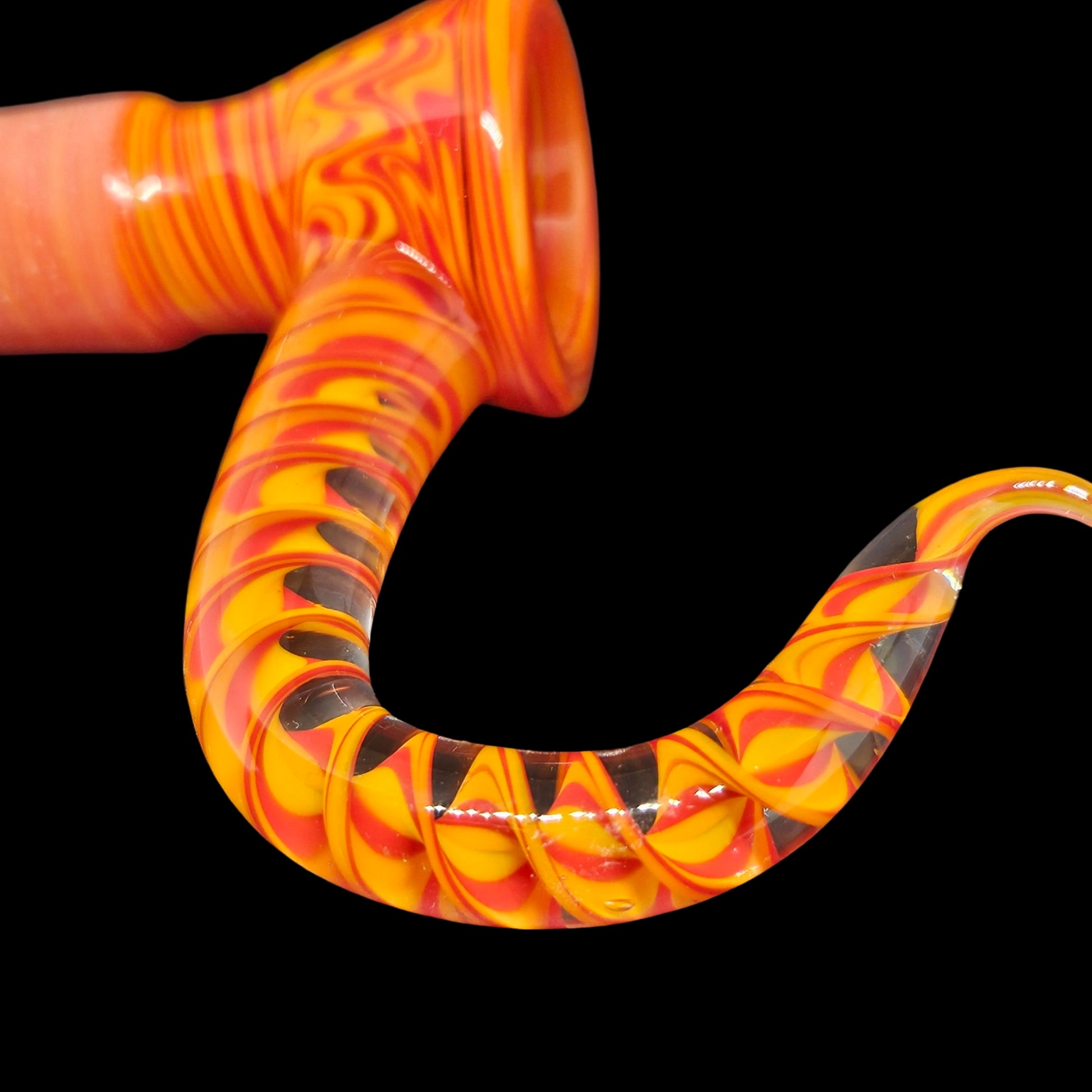 This fully worked bowl is made with 3 transitioning patterns to make up this fire themed colorway section. The horn is composed of a flattened section that's been encased and spun into ribbon cane to match the piece perfectly