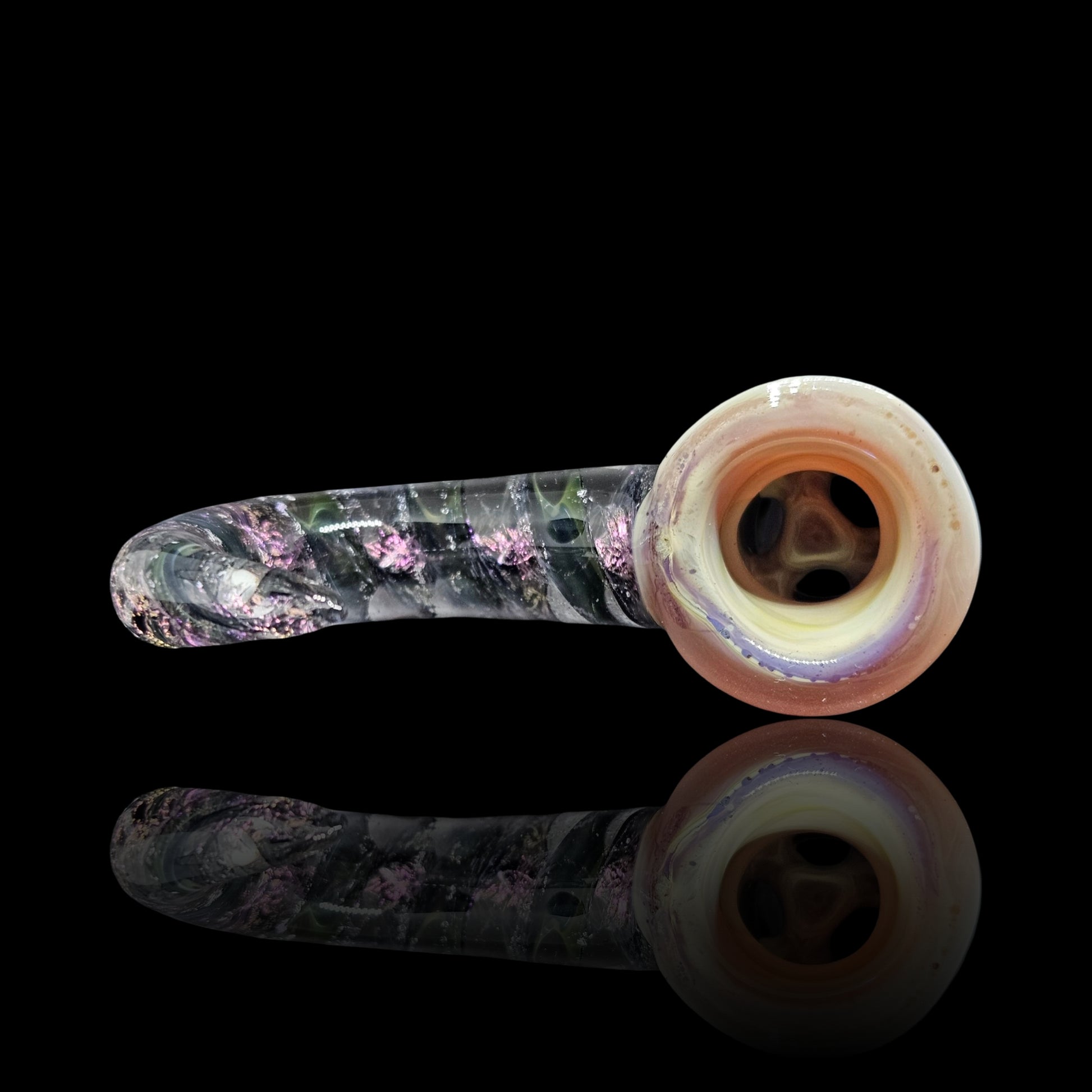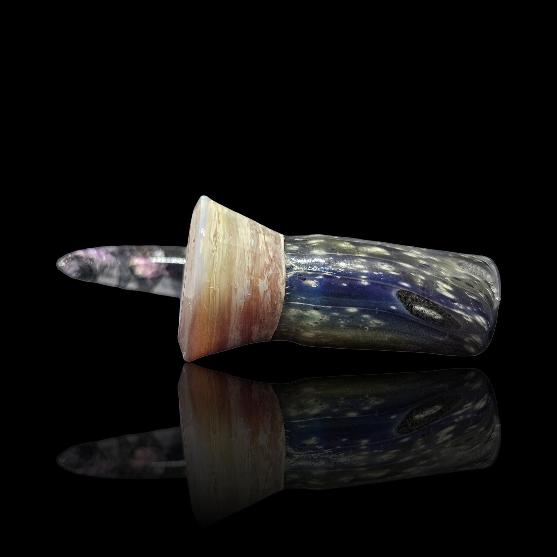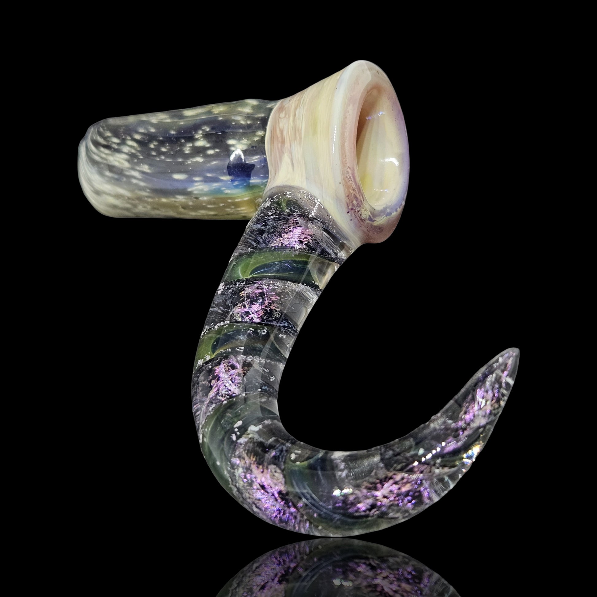 This fully worked bowl is made with 24k and pure silver to make the space pattern matched with a blossom burst section that resembles the colors of Jupiter. I built a matching space themed ribbon cane decked out in purple dichro
