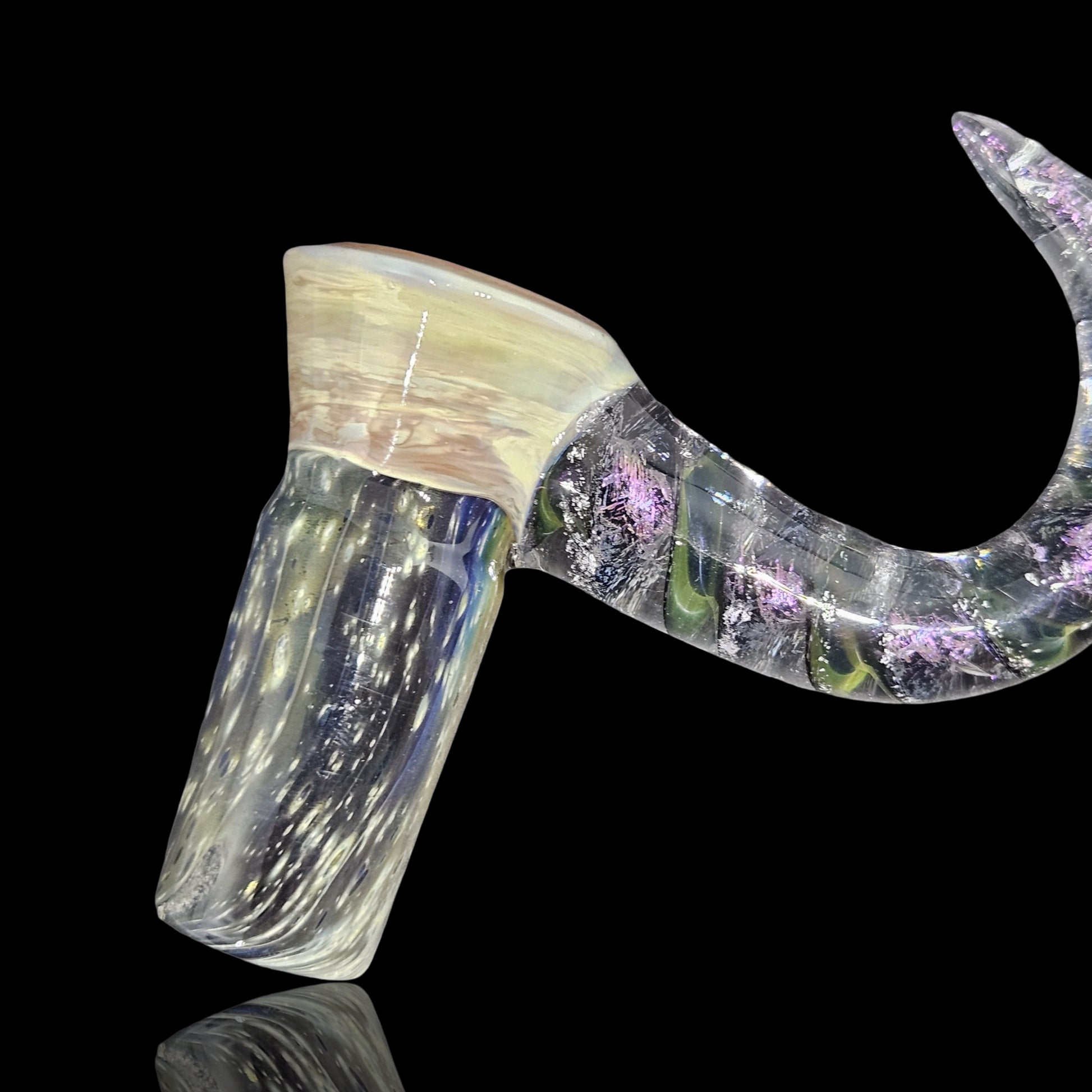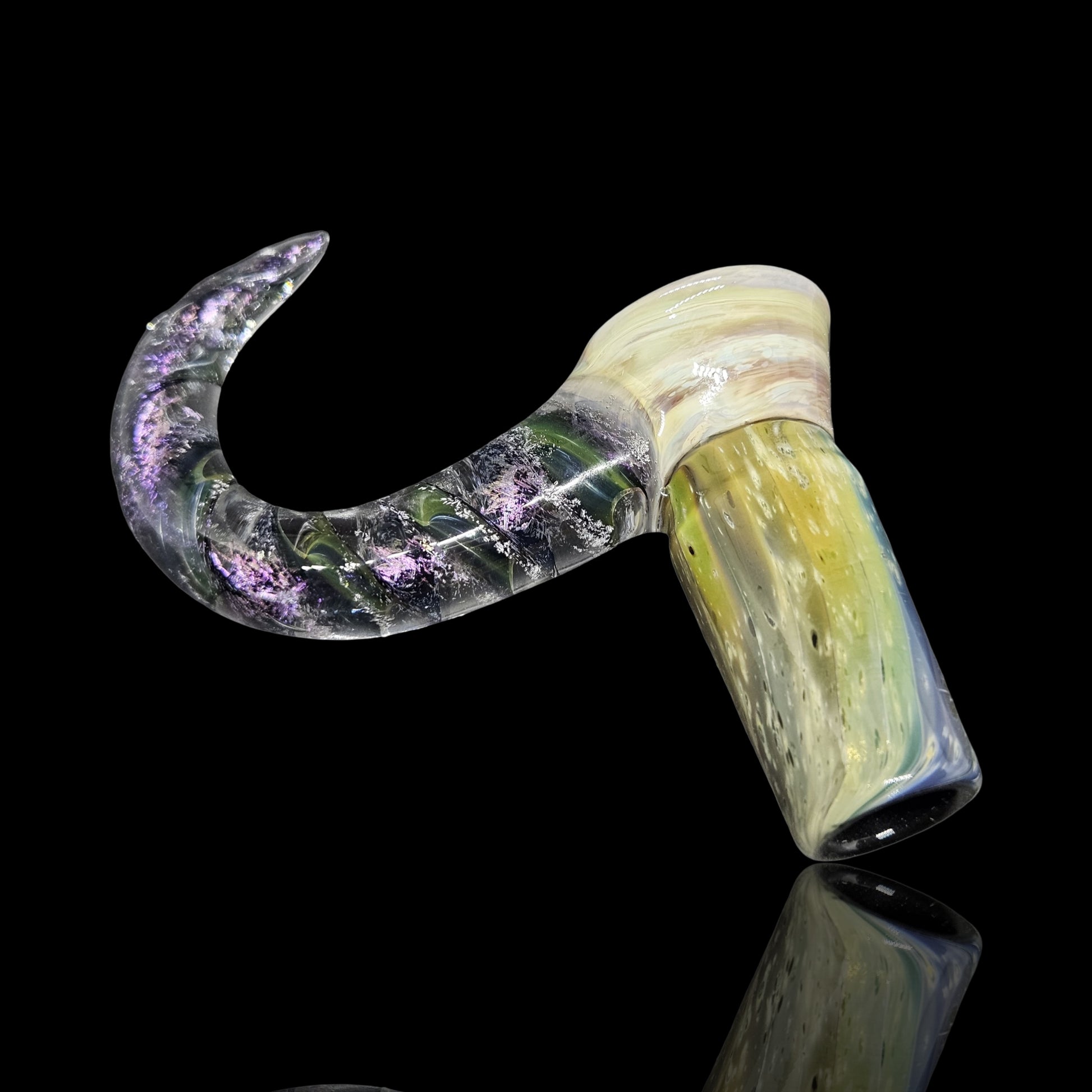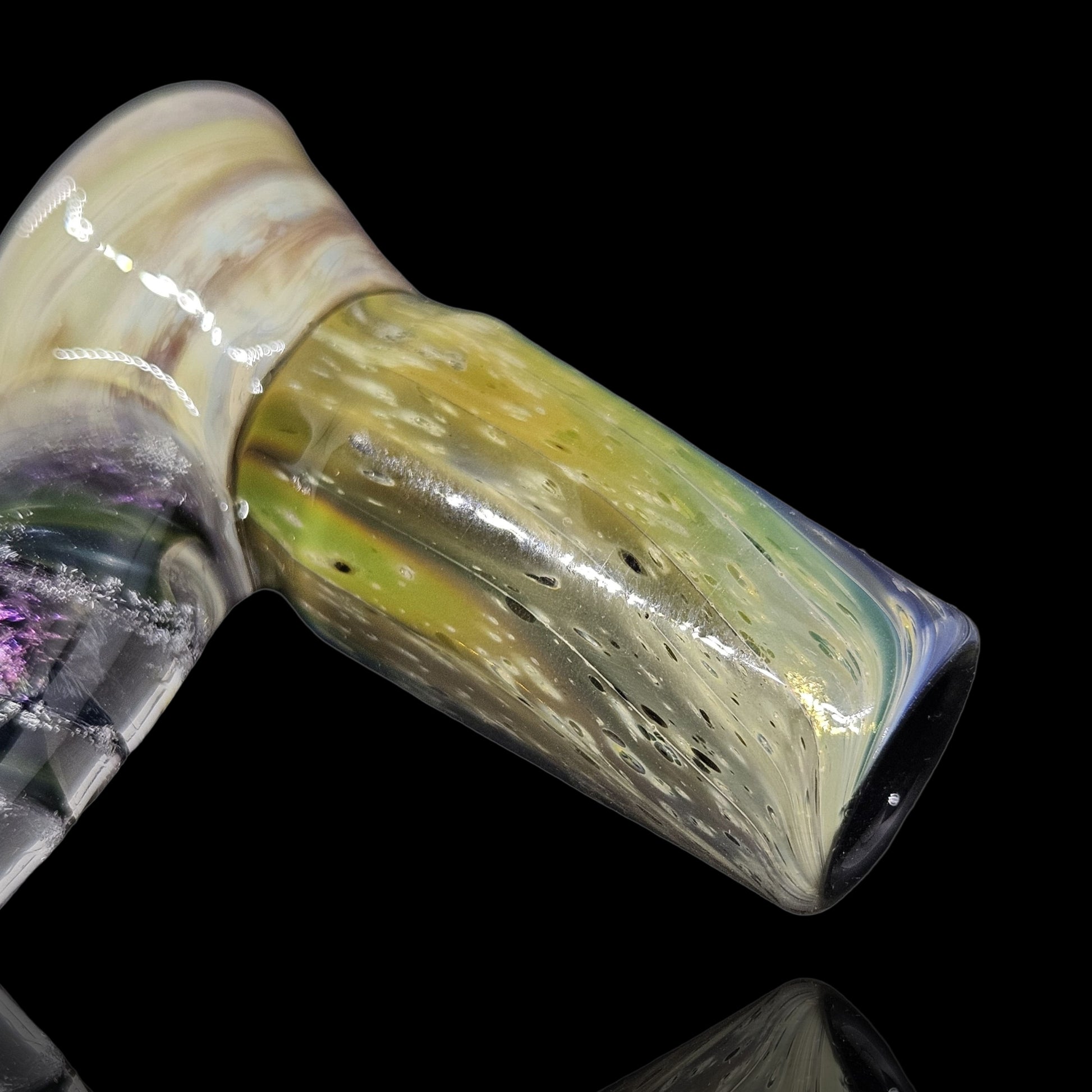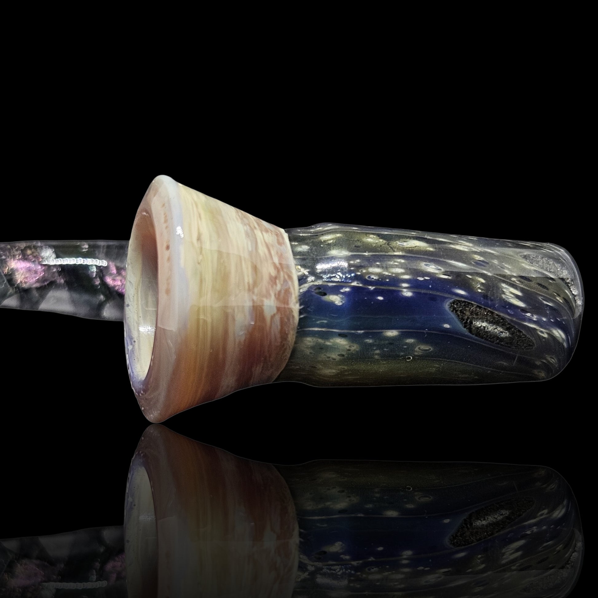This fully worked bowl is made with 24k and pure silver to make the space pattern matched with a blossom burst section that resembles the colors of Jupiter. I built a matching space themed ribbon cane decked out in purple dichro